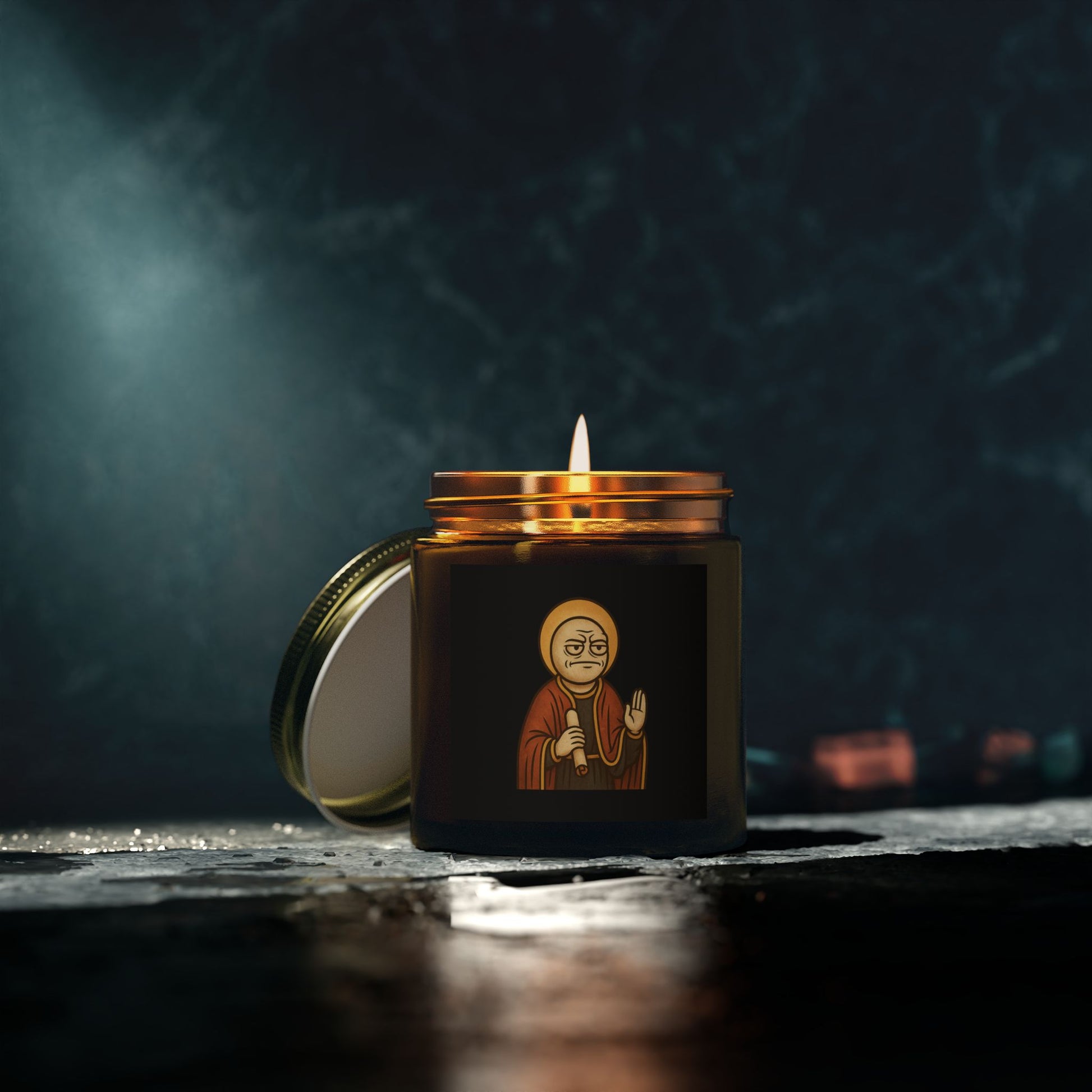 A relic of light and scent. This isn’t just a candle—it’s ritual fire captured in an amber vessel, pouring out devotion one flicker at a time. Each soy-based flame carries whispers of forgotten memes, holy nostalgia, and the quiet reverence of a space transformed.