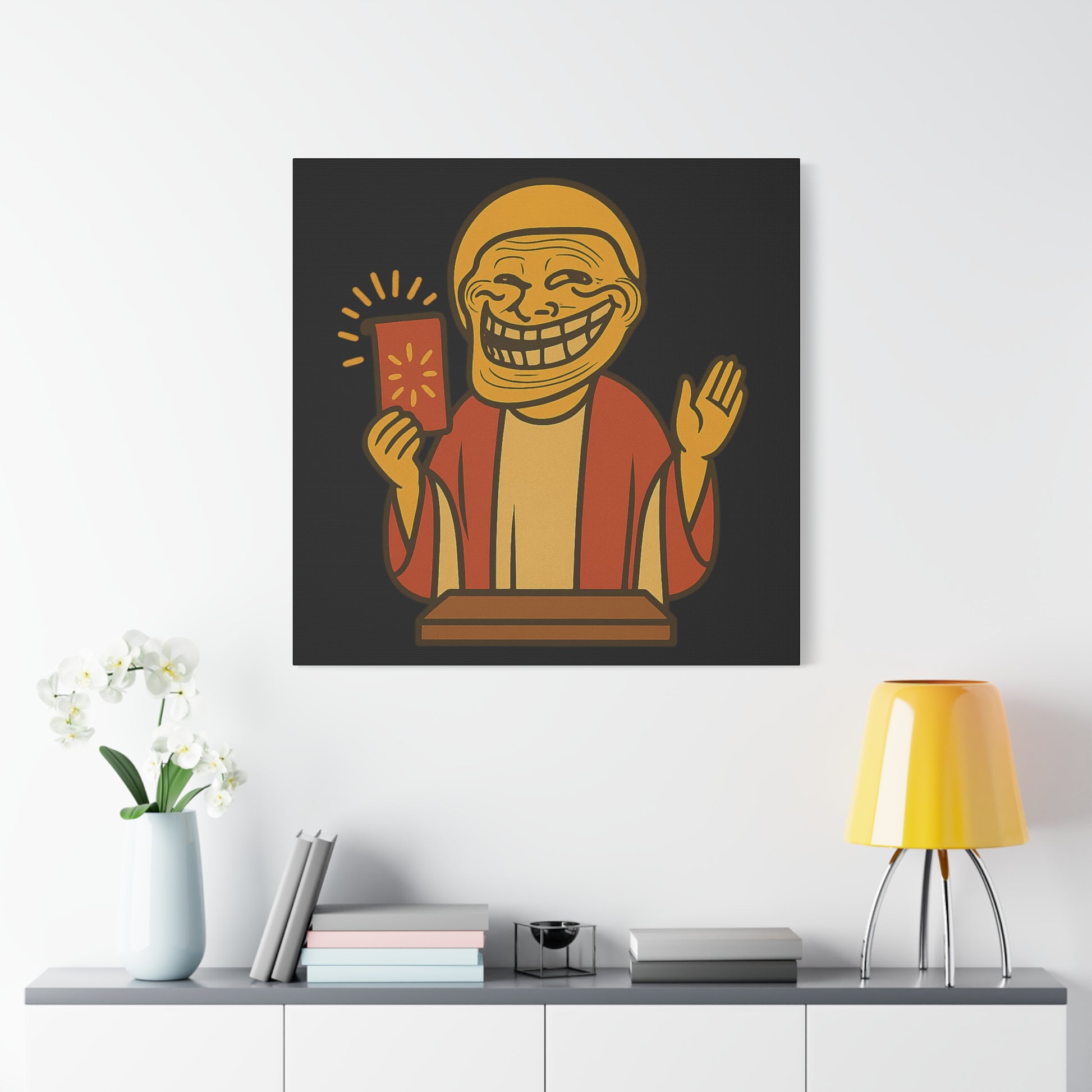 Not just a print—an icon. This stretched canvas carries color like scripture and detail like a relic. Designed to turn any wall into an altar of personality, it’s the perfect focal point for your temple of irony, art, or devotion to the feed.